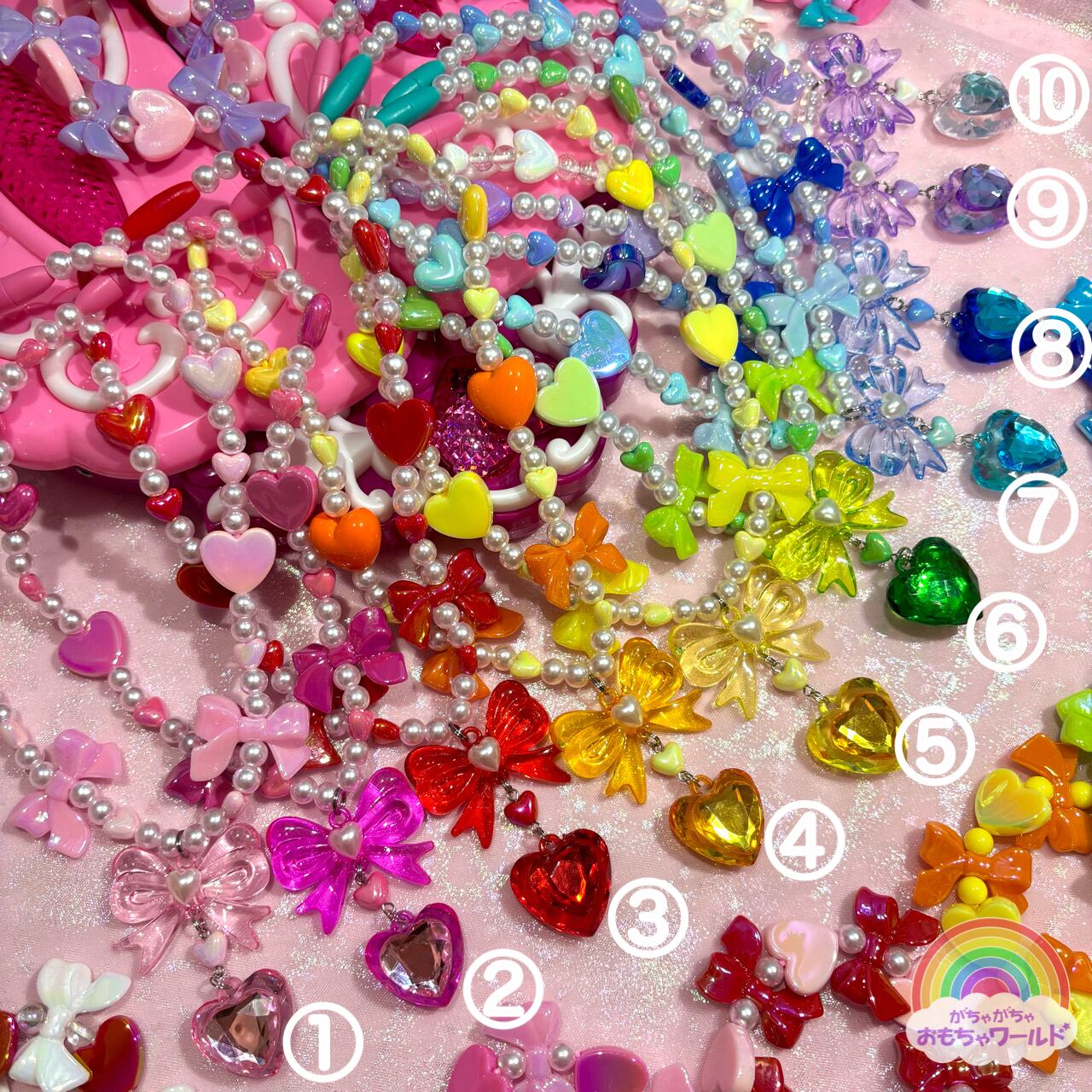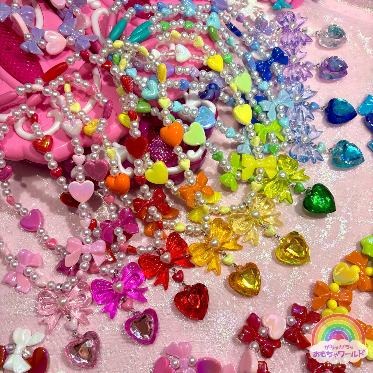 大きなリボンのモチーフとキラキラのハートがかわいいパールのネックレスです。