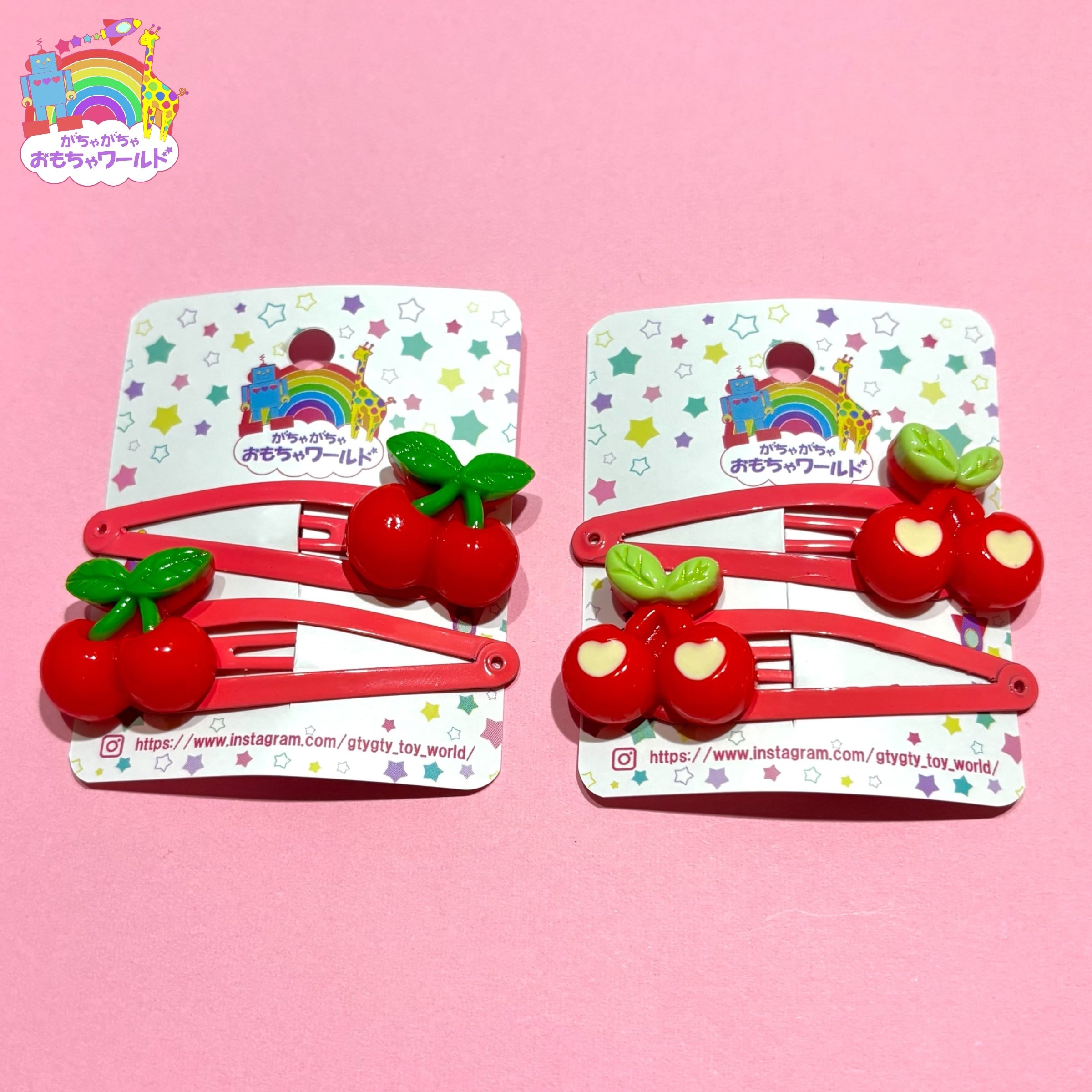 真っ赤なさくらんぼとハートにくり抜かれたさくらんぼがかわいいぱっちんピンです。